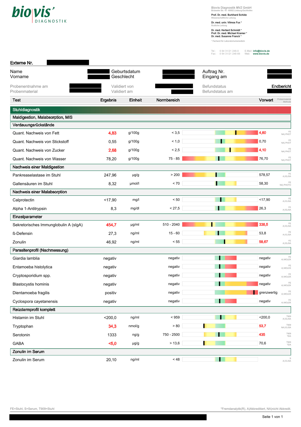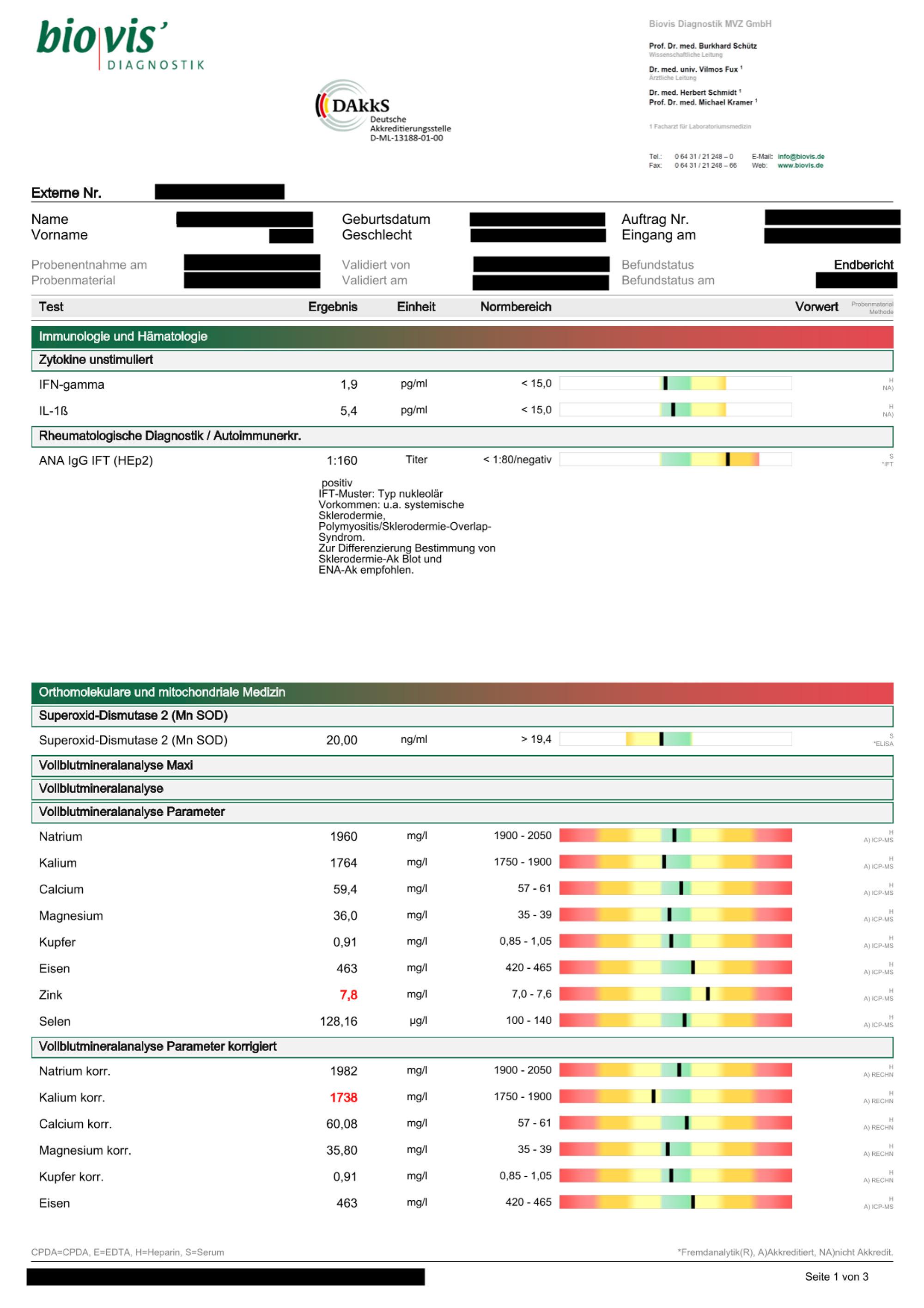 Ich lasse in verschiedene Labore einsenden. Die bekanntesten sind das Labor Biovis in Limburg an der Lahn, das Labor IMD Berlin und das Labor GANZIMMUN Diagnostics in Mainz. Zudem sende ich Proben an das örtliche MVZ Labor Limbach in Aachen.