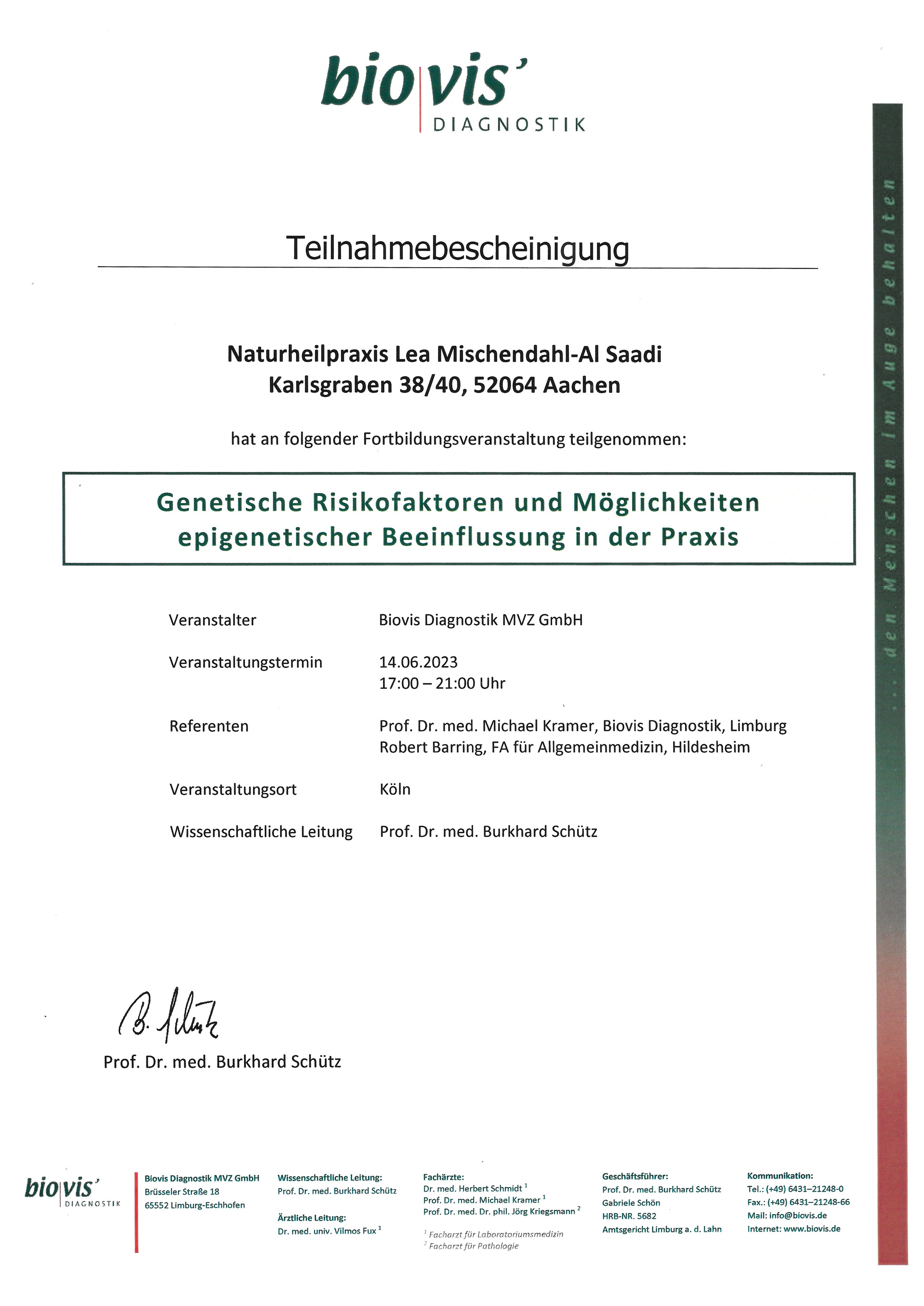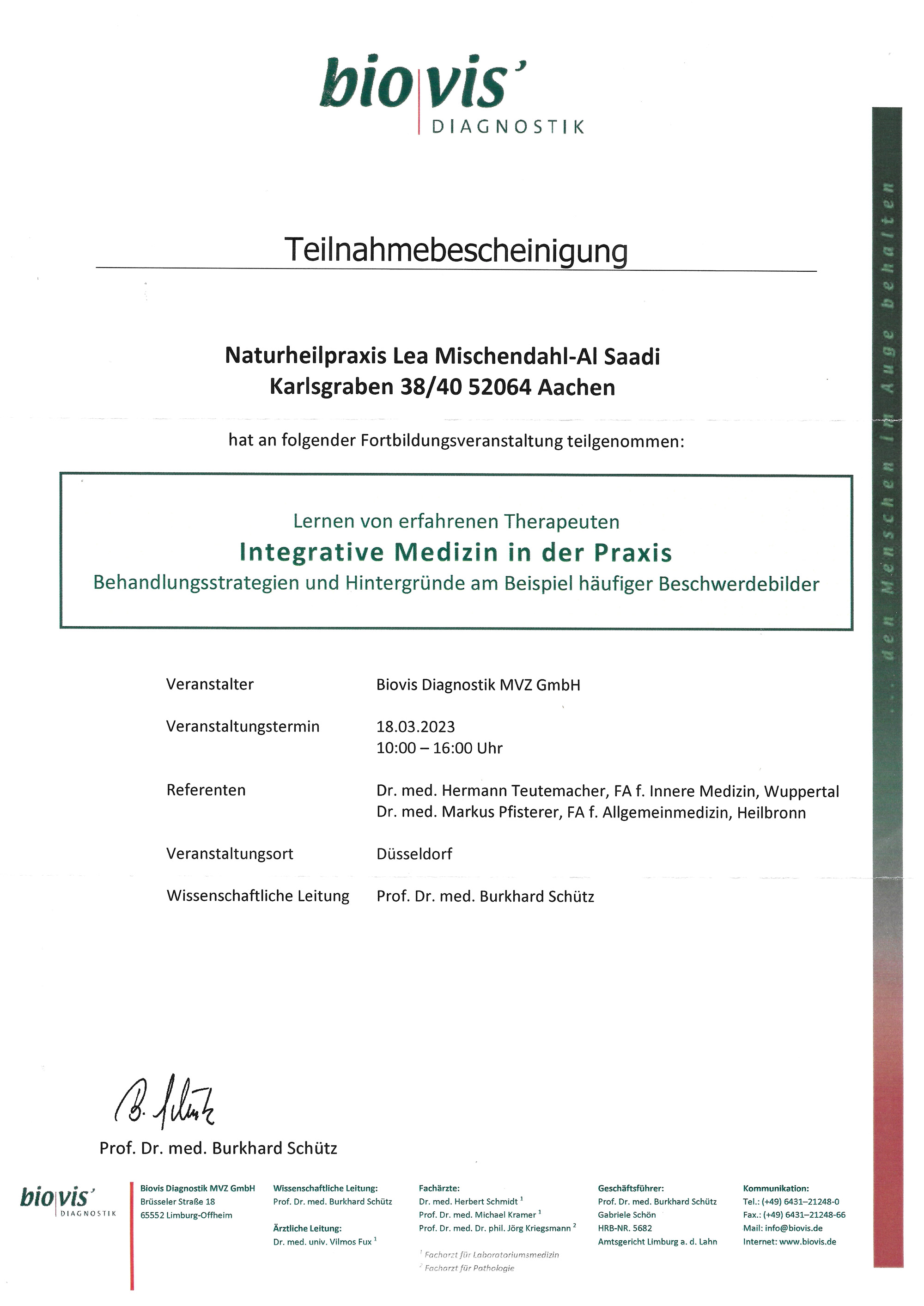 In der funktionellen Medizin gibt es ständig neue Erkenntnisse. Daher ist mir eine kontinuierliche Weiterbildung in meinen Schwerpunktbereichen sehr wichtig. Im Folgenden finden Sie meine bisherigen Zertifikate von Fort- und Weiterbildungen als Heilpraktikerin.